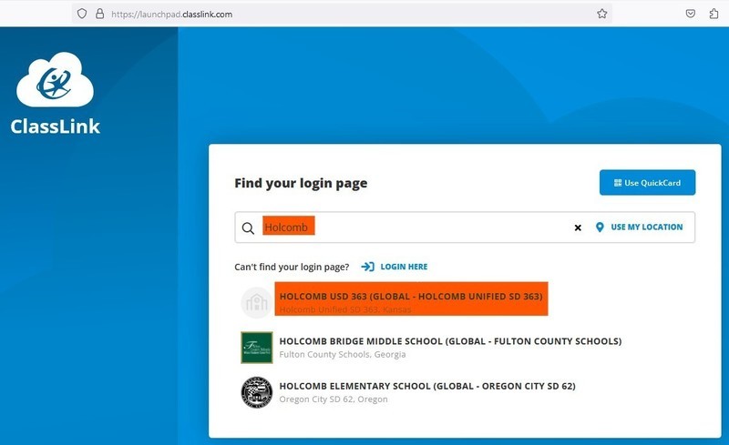 You can also go to launchpad.classlink.com and search for your school’s login page by entering your district name in the search bar.